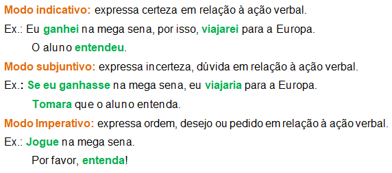 Já os modos verbais expressam o modo como a pessoa do discurso se relaciona ao fato ocorrido. Temos três modos verbais: