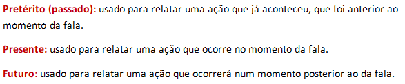 Temos também os tempos verbais. Eles indicam quando a ação do verbo ocorreu, ocorre ou ocorrerá. Temos três tempos verbais básicos, que são: