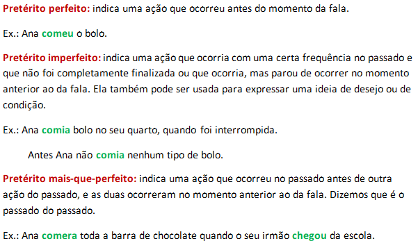 Essas são as três marcações de tempo, mas, em alguns tempos verbais, temos algumas subdivisões. O primeiro que veremos é o pretérito (passado). Dentro dele, temos três subdivisões.